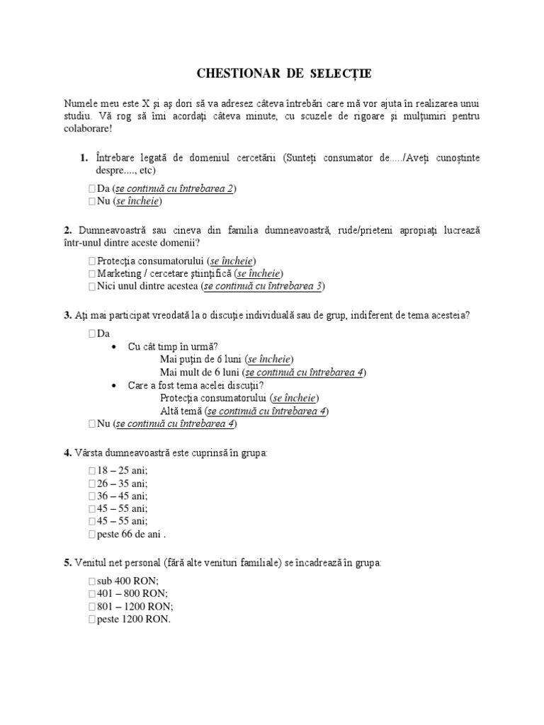 Model Chestionar De Selectie Cercetari