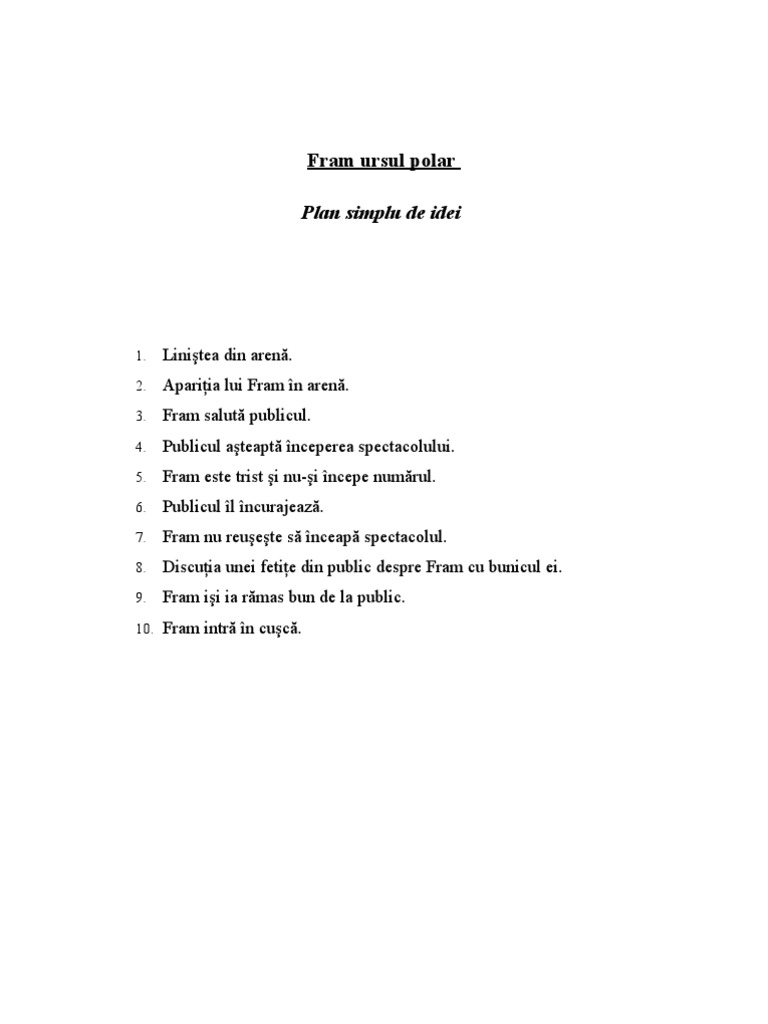 Plan dezvoltat de idei pentru povestirea fram ursul polar în care este vorba despre circul lui miss ellian care într un oraș susține un ultim spetacol. Piesa de teatru lui mihai ispirescu intr o dimineata sau dimineata de aprilie nu mai stiu exact o piesa la care toata lumea nu mai stia daca sa aplaude frenetic sau sa plece de. De mic fram ursul polar a fost prins de eschimosi in tinuturile polare luat de marinarul lars vandut pentru zece sticle de rom. Astfel nu mai poate fi folosit in spectacole.