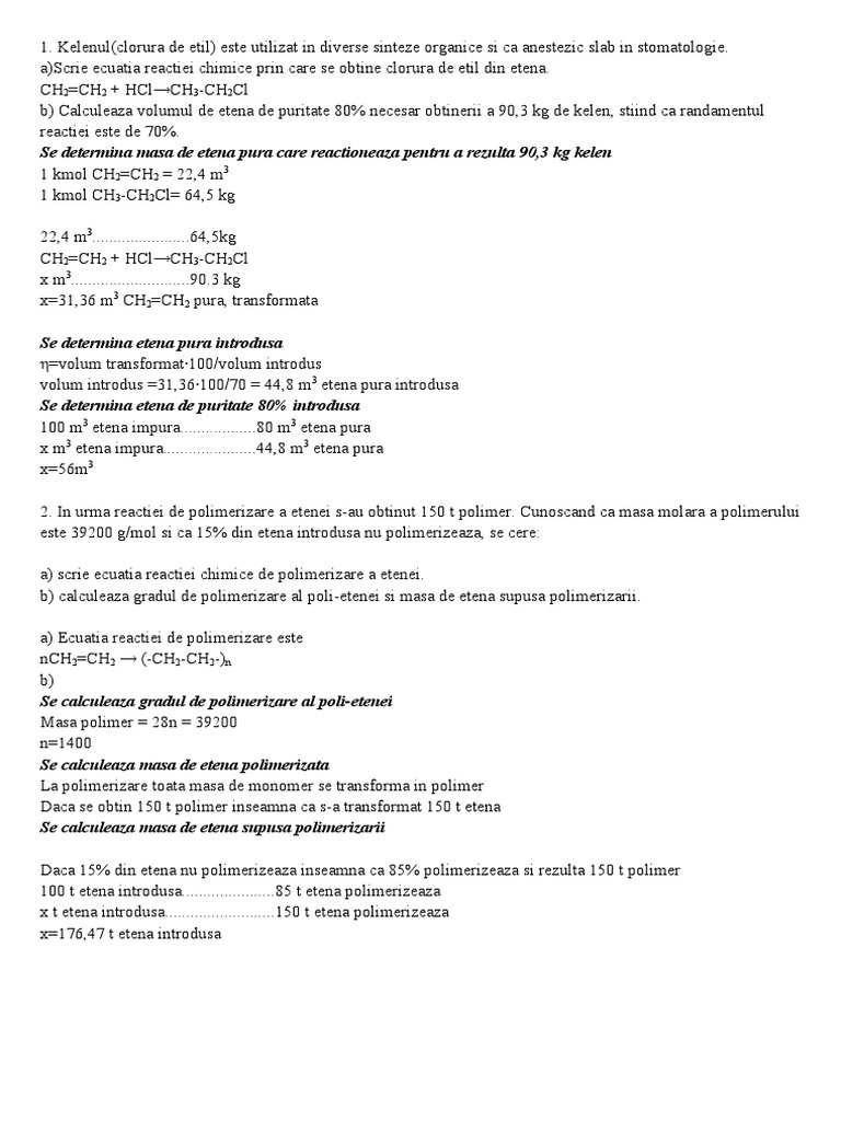 Reacții de polimerizare și copolimerizare. Este o grupa de materiale obtinute prin polimerizare. Reacţia de copolimerizare a butadienei cu monomeri vinilici. In urma reactiei de polimerizare a etenei s au obtinut 150 t polimer cunoscand ca masa molara a polimerului este 39200 g mol si ca 15 din etena introdusa nu polimerizeaza se cere.