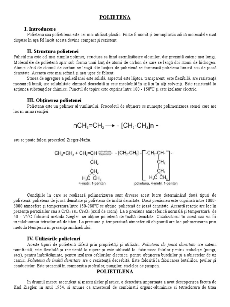 Moleculele de etena se leaga unele de altele intr o succesiune care depinde de conditiile de reactie. Ch2 ch2 n n 640 1250 polietilena de inalta presiune polimerizarea radicalica a etenei initiata de oxigen molecular pana la 0 05 la presiune de 1000 1500 at si 190 c. Polietilena polietena dupa procedeele de polimerizare folosite. Polietilena de presiune medie polimerizarea etenei intr un solvent toluen xileni in care.