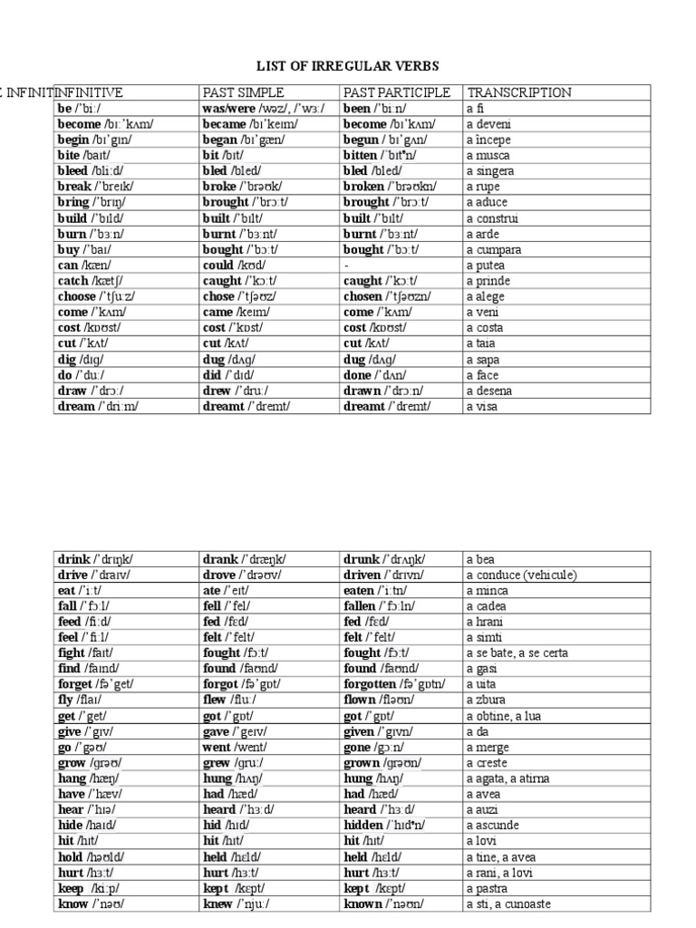 Irregular Verbs List Cu Traducere In Romana