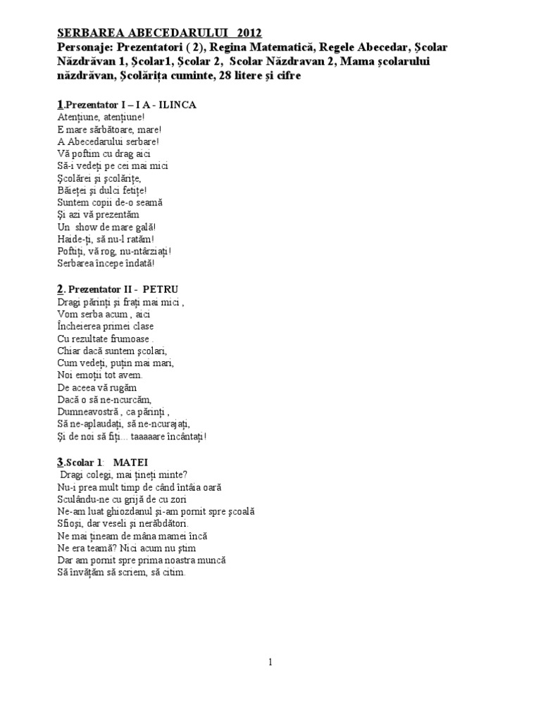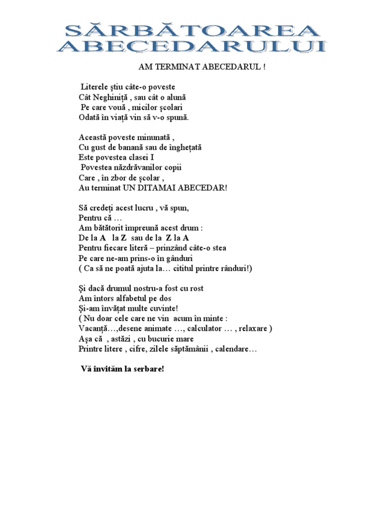 Litere pentru serbarea abecedarului. Cantece serbarea abecedarului 1 mergem toti in pas frumos ca soldatii drept voios. Abecedarul literele alfabetului un elev copiii sunt aşezaţi în semicerc. Descărcaţi 0 review uri 1897 descărcări. Manuale atractive si eficiente pentru elevii de scoala primara.
