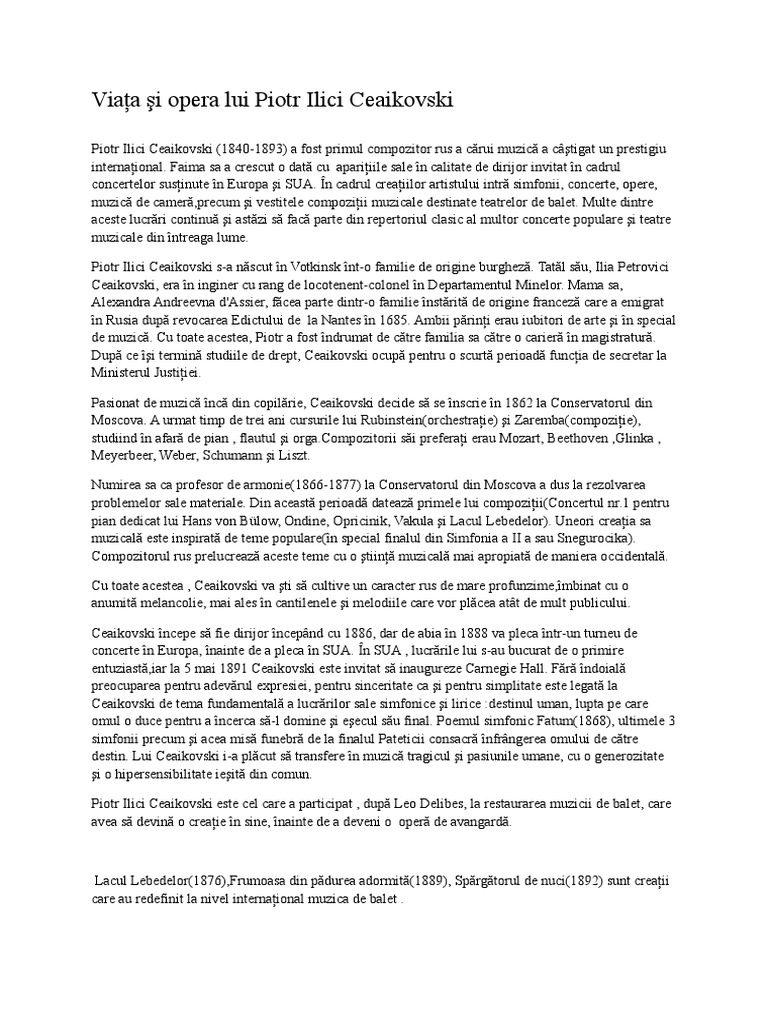 în cadrul creaţiilor artistului intră simfonii concerte opere muzică de cameră precum şi vestitele compoziţii muzicale destinate. Compozitorul piotr ilici ceaikovski s a născut la 7 mai 1840 la kamsko wotkinski sawod într o familie burgheză la vârsta de cinci ani a început să studieze pianul. Cel mai cunoscut compozitor rus al tuturor timpurilor. în toată această perioadă s a ocupat şi de.