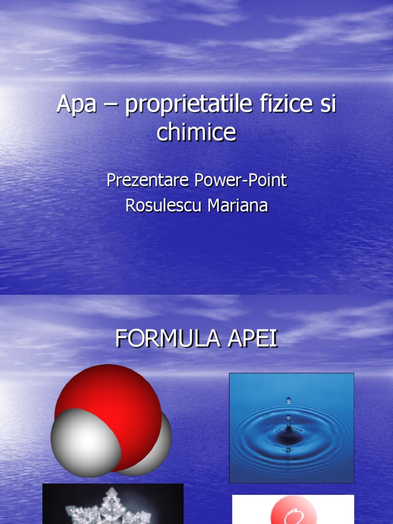 Proprietăţile fizice şi chimice ale apei. 4 3 proprietăţi chimice ale apei apa poate reacţiona cu o serie de substanţe simple sau compuse în reacţii fără modificarea stării de oxidare cu oxizi acizi cu oxizi bazici în reacţiile de hidroliză etc sau în reacţii cu modificarea stării de oxidare cu metale cu nemetale etc. După cum ştim apa este un compus chimic al hidrogenului şi oxigenului cunoscut sub formula chimică h 2 o. Apa este o substanță absolut indispensabilă vieții indiferent de forma acesteia fiind unul dintre cei mai universali solvenţi.