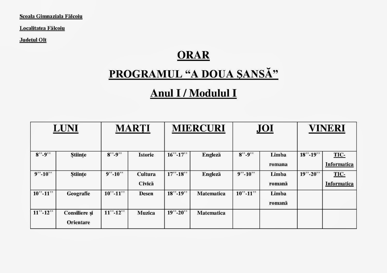 2 depunerea dosarelor de înscriere în anul i al programului a doua șansă pentru învățământul secundar inferior se poate face de două ori pe parcursul unui an din. Orar gimnaziu orar primar. Programul a doua şansă învăţământ secundar inferior are drept scop sprijinirea persoanelor cu vârsta de peste 14 ani care nu au finalizat învăţământul gimnazial absolvenți de clasele a v a a vi a sau a vii a astfel încât acestea să îşi poată completa şi finaliza educaţia de bază din cadrul învăţământului obligatoriu precum şi pregătirea pentru obţinerea unei calificări profesionale într un anumit domeniu. Au absolvit învăţământul primar obligatoriu inclusiv în sistemul a doua şansă dar nu şi au continuat educaţia mai departe sau.