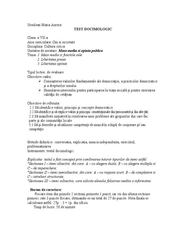 Test De Evaluare Cu Itemi Si Barem De Corectare